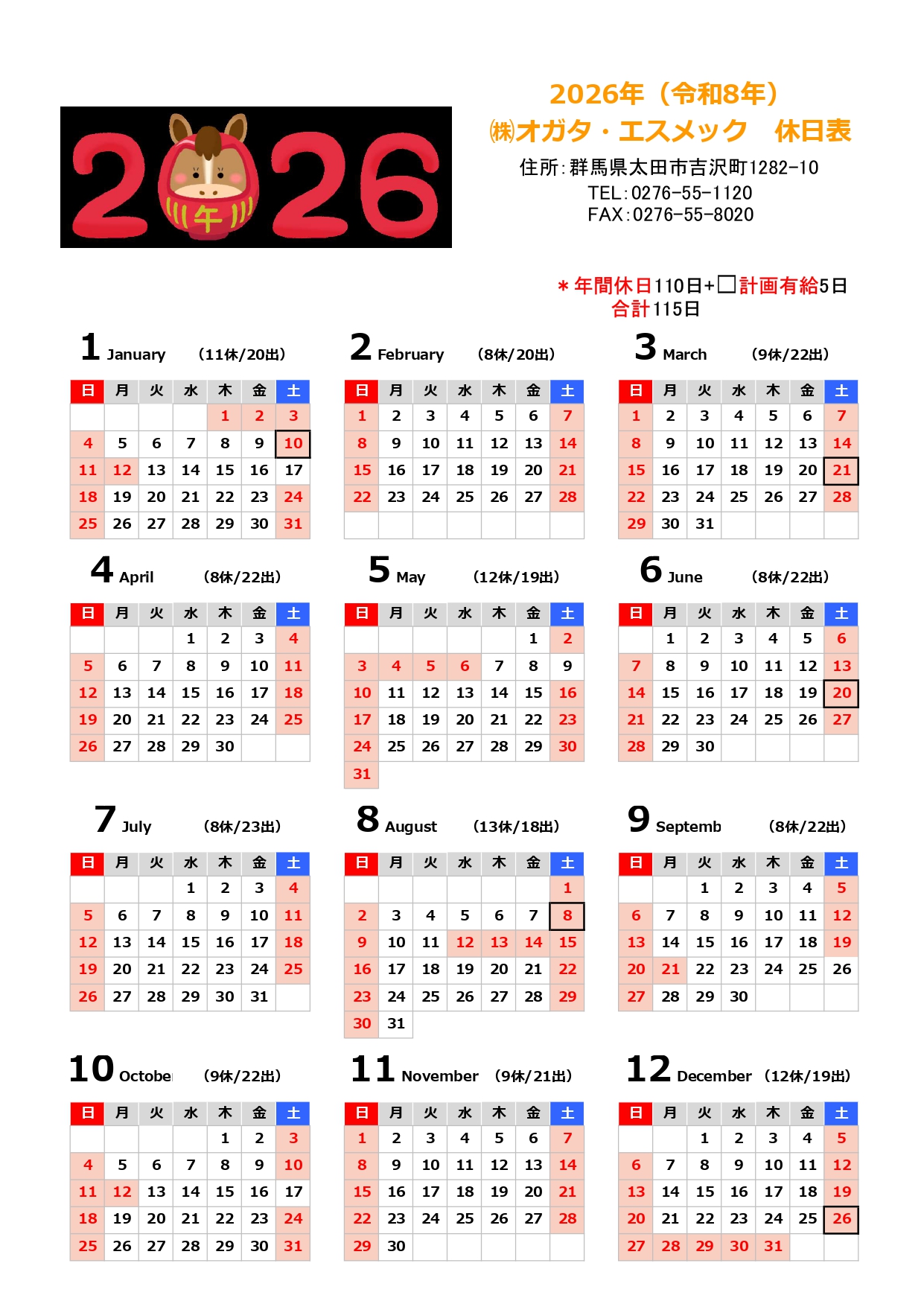 2026年より、年間休日110日+計画有給5日、合計年間休日115日となりましたのでお知らせいたします。